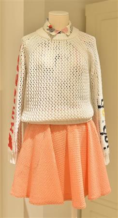 - ポール_&_ジョー_シスターはカジュアルなパリジェンヌを演出。白いコットンニットのセーター(2万4840円)にオレンジメッシュのスカート(1万7280円)、ブラウスの襟をのぞかせて(2万520円)の襟をのぞかせて=2015年1月14日、東京都中央区銀座(三尾郁恵撮影)更新