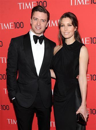 米歌手・俳優、ジャスティン・ティンバーレイクさん(左)と、妻で米女優のジェシカ・ビールさん=2013年4月23日、米ニューヨーク(AP)