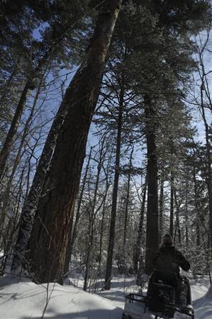 - チョウセンゴヨウの大木をすり抜けて森の奥へ向かう=2013年3月15日、ロシア・クラスヌィ・ヤール村(伊藤健次さん撮影)更新