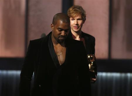米ラップ歌手、カニエ・ウェストさん(手前)が米歌手、ベックさん(後方)=2015年2月9日、米カリフォルニア州ロサンゼルス(ロイター)