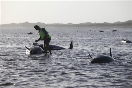 ニュージーランド南島の北端に位置するゴールデン湾のフェアウェル岬の浜辺で、200頭近いゴンドウクジラが浅瀬に打ち上げられた=2015年2月13日(AP)