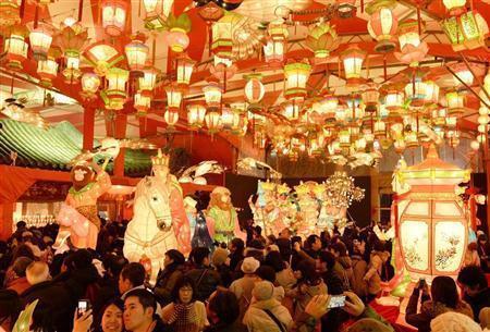 中国の春節(旧正月)に合わせて始まった「長崎ランタンフェスティバル」=2015年2月19日夜、長崎県長崎市の湊公園(共同)
