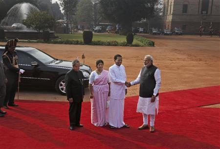 首都ニューデリーの大統領宮に到着したスリランカのマイトリパラ・シリセナ大統領夫妻(中央)を出迎える、インドのナレンドラ・モディ首相(右)とプラナブ・ムカジー大統領(左)=2015年2月16日、インド(AP)
