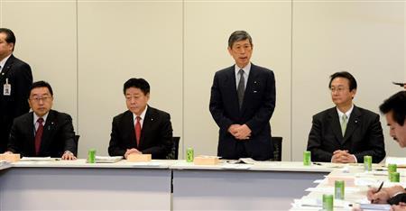 新たな安全保障法制の整備に向けた与党協議会であいさつする座長の自民党の高村(おうむら)正彦副総裁(中央右)。左隣は公明党の北側一雄副代表=2015年2月20日、衆院第2議員会館(酒巻俊介撮影)