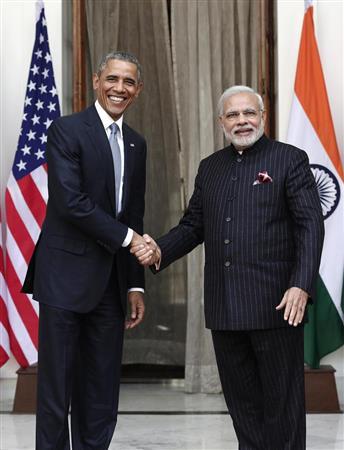 インドのナレンドラ・モディ首相(右)と、米国のバラク・オバマ大統領=2015年1月25日、インド・首都ニューデリー(ロイター)