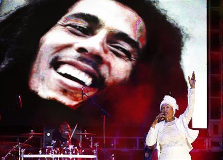 ジャマイカのレゲエ歌手、ボブ・マーリー氏(1945~81年、写真奥)=2015年2月8日、ジャマイカ・首都キングストン(ロイター)