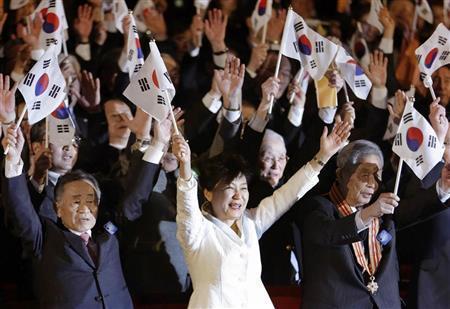日本統治下の1919年に起きた「3・1独立運動」を記念する政府式典で太極旗(韓国国旗)を振る朴槿恵(パク・クネ)大統領(中央)。国民の支持率は低迷し、対日関係も冷え切ったままの中、残り任期3年の政権運営は容易ではない=2015年3月1日、韓国・首都ソウル(ロイター)