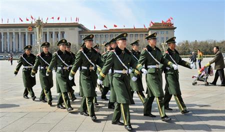 全人代の開幕を控え、北京の人民大会堂周辺を警備する武装警察隊員=2015年3月4日、中国・首都北京市西城区(共同)