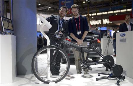 米フォード・モーターがスペイン・カタルーニャ自治州バルセロナで開かれた携帯端末の見本市モバイル・ワールド・コングレスに出展した電動自転車「イー・バイク」のデモンストレーション=2015年3月4日(AP)