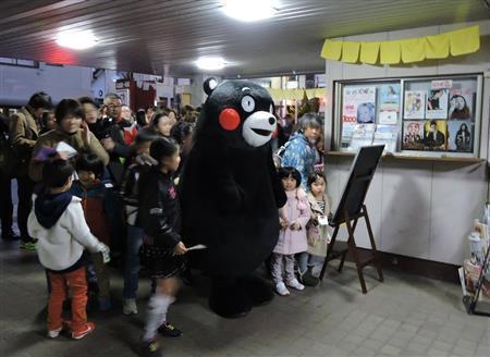 - 本渡第一映劇の前には、くまモンに手を引かれた子供たちを先頭に市民らの列ができた=2015年2月15日、熊本県天草市(藤沢志穂子撮影)更新