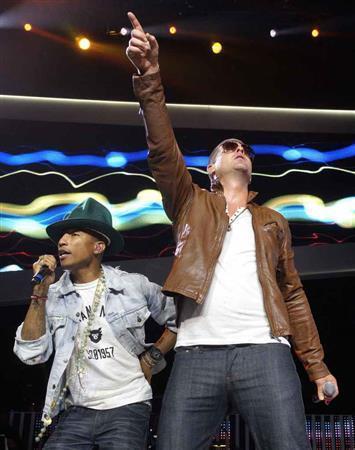 米歌手のロビン・シックさん(右)とファレル・ウィリアムスさん=2015年3月10日、米アーカンソー州フェイエットビル(ロイター)