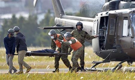 広域医療搬送の訓練で、ヘリから患者を運び出す自衛隊員ら=2014年11月、宮城県仙台市若林区の陸上自衛隊霞目駐屯地(共同)
