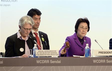 国連防災世界会議で「仙台防災枠組」を採択する山谷(やまたに)えり子防災相(右)=2015年3月18日深夜、宮城県仙台市(共同)