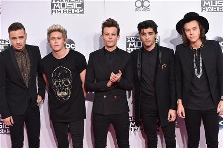 英ボーイズグループ「ワン・ダイレクション(1D)」のルイ・トムリンソンさん(中央)=2014年11月23日、米カリフォルニア州ロサンゼルス(AP)