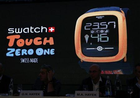 支払い機能を搭載したスマートウオッチ「スウォッチタッチ_ゼロワン」の発売を発表するスイスの時計メーカー「スウォッチ」=2015年3月12日、スイス・コルジェモン(ロイター)