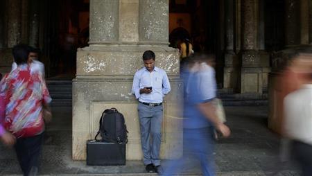 インド西部ムンバイの鉄道駅構内で、スマートフォンを見つめる男性。インド最高裁は、インターネット上で誹謗中傷などをした者に刑事罰を科すことを定めた情報技術法の条項は違憲との判決を下した=2015年3月24日(AP)