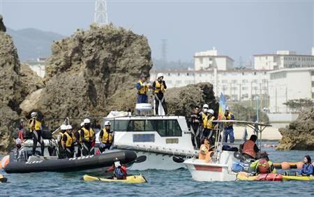 辺野古沖でカヌーに乗り、海上保安官とにらみ合う基地建設反対派の人たち=2015年3月30日午前、沖縄県名護市(共同)