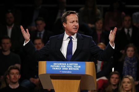 3月28日、イングランド北部マンチェスターで開かれた保守党の大会で、基調演説する党首のデービッド・キャメロン首相=2015年、英国(ロイター)