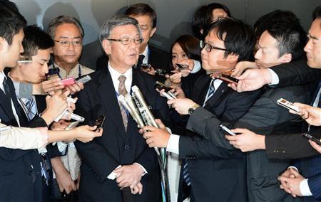 4月2日午後、内閣府で山口俊一(しゅんいち)沖縄北方担当相との会談を終え、記者団の質問に答える沖縄県の翁長雄志(おなが・たけし)知事。昨年12月の知事就任後、翁長氏の上京は8回目で、山口氏との会談は3回目だ=2015年、東京都千代田区(酒巻俊介撮影)
