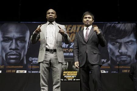 3月11日、難航していた対戦交渉がまとまり、記者会見の場でポーズを取るフロイド・メイウェザー(左)とマニー・パッキャオの両雄=2015年、米カリフォルニア州ロサンゼルス(AP)