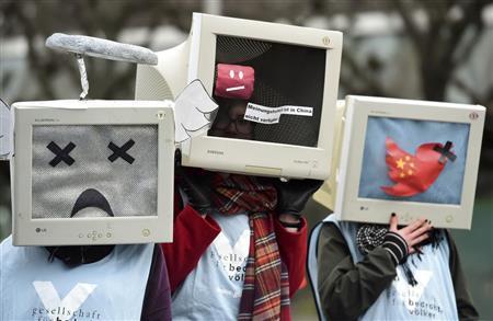 パソコンのモニターをかぶり顔を隠すパーフォーマンス。「プライバシー保護」と「知る権利」のバランスが問われている=2015年3月15日、ドイツ・ハノーバー(ロイター)