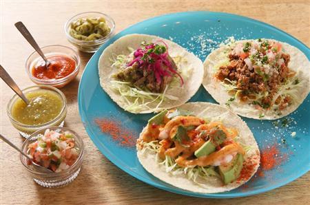 - 煮込みビーフ、挽肉のスパイシーミート、エビとアボカドと3種類あるタコス(各500円~)も、ソフトな食感のトルティーヤ(皮)を使った本場の味だ=2015年3月23日、京都市中京区(志儀駒貴撮影)更新