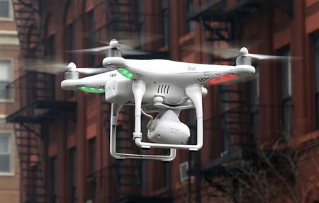 米ニューヨークでビルの谷間を飛ぶ新型小型無人機「ドローン」=2014年3月12日(ロイター)