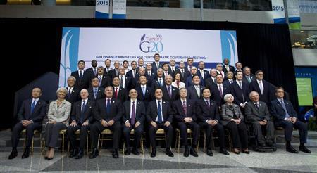 記念撮影に臨むG20財務相・中央銀行総裁会議の参加者ら=2015年4月17日、米国・首都ワシントン(AP)
