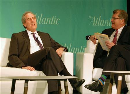 4月23日、米首都ワシントンで、TPP(環太平洋戦略的経済連携協定)交渉について講演する米通商代表部のマイケル・フロマン代表(左)=2015年(共同)