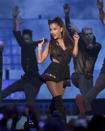 米歌手、アリアナ・グランデさん(中央)=2015年3月20日、米ニューヨーク(AP)