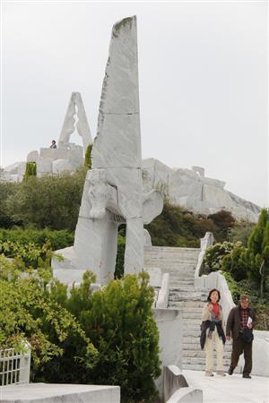 - 未来心の丘を制作した環境彫刻家の杭谷一東(くえたに・いっとう)さん。世羅町で個展を開催するためたまたま帰国していた=2015年4月9日、広島県尾道市の生口島にある耕三寺「未来心の丘」(田中幸美撮影)更新