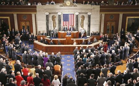 日本の首相として初めて米議会の上下両院合同会議で演説した安倍晋三(しんぞう)首相。英語での約45分の演説中、スタンディングオベーションは14回にも上った=2015年4月29日、米国・首都ワシントン(共同)