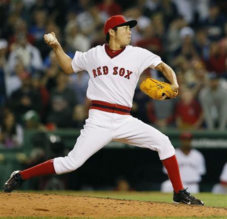 レイズ戦で1975年のワールドシリーズ優勝当時の復刻ユニホームを着て好投し、5セーブ目を挙げたレッドソックス・上原浩治=2015年5月5日、米マサチューセッツ州ボストン(共同)