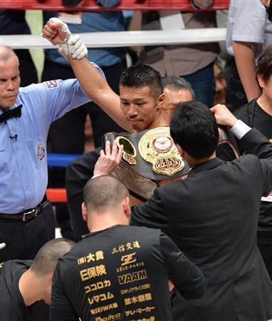 ジョムトーン・チューワッタナ(タイ)に勝利し10度目の防衛を果たした内山高志(中央)=2015年5月6日、東京都大田区・大田区総合体育館(納冨康撮影)