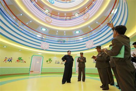 幼児向け施設を視察する金正恩第1書記(中央)。朝鮮中央通信が公開した=北朝鮮(ロイター)
