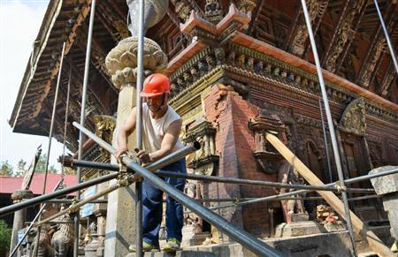 世界遺産の寺院、チャングナラヤンで、傾いた建物を支える処置をする作業員=2015年11月9日、ネパール・首都カトマンズ近郊(共同)