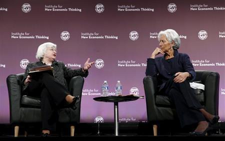 5月6日、国際通貨基金(IMF)のクリスティーヌ・ラガルド専務理事(右)と対談する米連邦準備制度理事会(FRB)のジャネット・イエレン議長。席上、株価の割高さに言及し、バブル発生への警戒感を示した=2015年、米国・首都ワシントンのIMF本部(ロイター)