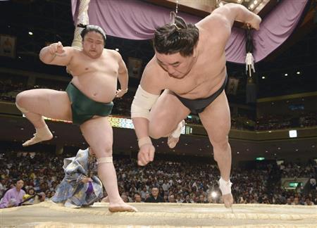 引っ掛けで佐田の海(左)が日馬富士(はるまふじ)を破り、初の金星を挙げた=2015年5月13日、東京都墨田区・両国国技館(共同)
