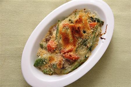 - 春野菜のグラタン(作り方3)__とろみがついてきたらスナップエンドウ、アスパラガスを加え、塩、こしょうで味を調え、耐熱皿に入れる。粉チーズ、パン粉をかけ、オーブントースターで焦げ目がつくまで焼く。更新