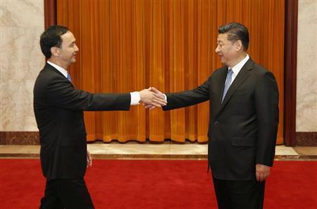 会談前に握手する台湾の与党、中国国民党の朱立倫主席(左)と中国共産党の習近平総書記=2015年5月4日、中国・首都北京市西城区の人民大会堂(共同)