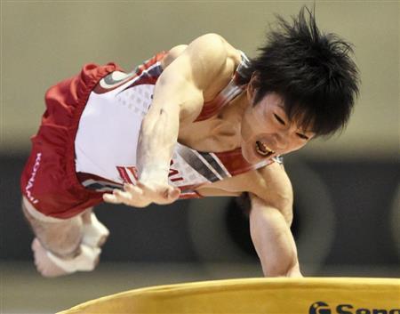 男子個人総合で優勝した内村航平の跳馬=2015年5月17日、東京都渋谷区・国立代々木競技場(共同)