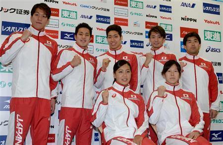 選手強化の拠点となる東京都北区の味の素ナショナルトレーニングセンターで会見する世界水泳の日本代表チーム=2015年4月13日、東京都北区・ナショナルトレーニングセンター(今野顕撮影)