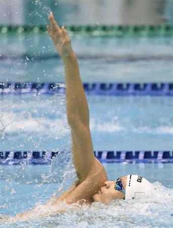 男子200メートル背泳ぎ決勝、1分55秒38で優勝した入江陵介=2015年5月23日、東京都江東区・東京辰巳国際水泳場(共同)