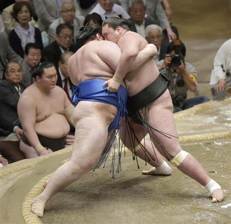 照ノ富士(右)が寄り切りで碧山(あおいやま)を下す。結びの一番で白鵬(左奥)が敗れ、初優勝を果たした=2015年5月24日、東京都墨田区・両国国技館(共同)