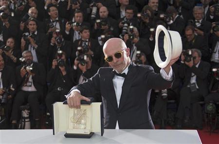 映画「ディーパン」が最高賞のパルムドールに輝き、カメラマンたちの前でポーズを決めるジャック・オディアール監督=2015年5月24日、フランス・カンヌ(ロイター)