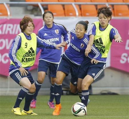 イタリア戦に向け、調整する(左から)阪口夢穂(みずほ)、澤穂希(ほまれ)、大儀見優季(おおぎみ・ゆうき)、熊谷紗希(さき)=2015年5月27日、長野県長野市・南長野運動公園総合競技場(共同)