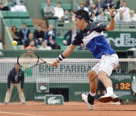 男子シングルス4回戦で、ボレーする錦織圭(にしこり・けい)=2015年5月31日、フランス・首都パリ(共同)