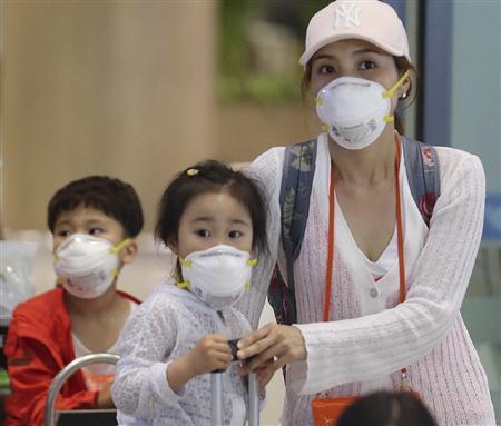 首都ソウル近郊の仁川国際空港で6月7日、中東呼吸器症候群(MERS)コロナウイルスの感染を防ぐため、マスクを身につけてゲートに向かう親子=2015年、韓国(AP)