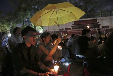 天安門事件から26年となった6月4日夜、香港のビクトリア公園で行われた追悼集会に集まった若者たち。昨年の香港民主化デモの象徴となった黄色い雨傘を掲げる学生の姿もみられた=2015年6月4日、中国・香港(AP)