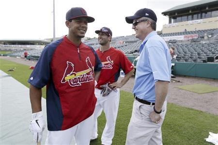 古巣カージナルスの選手と談笑するアストロズのジェフ・ルノーGM(右)=2013年2月25日、米フロリダ州ジュピター(AP)